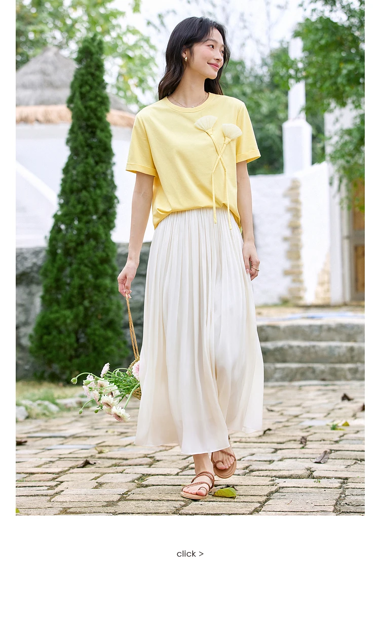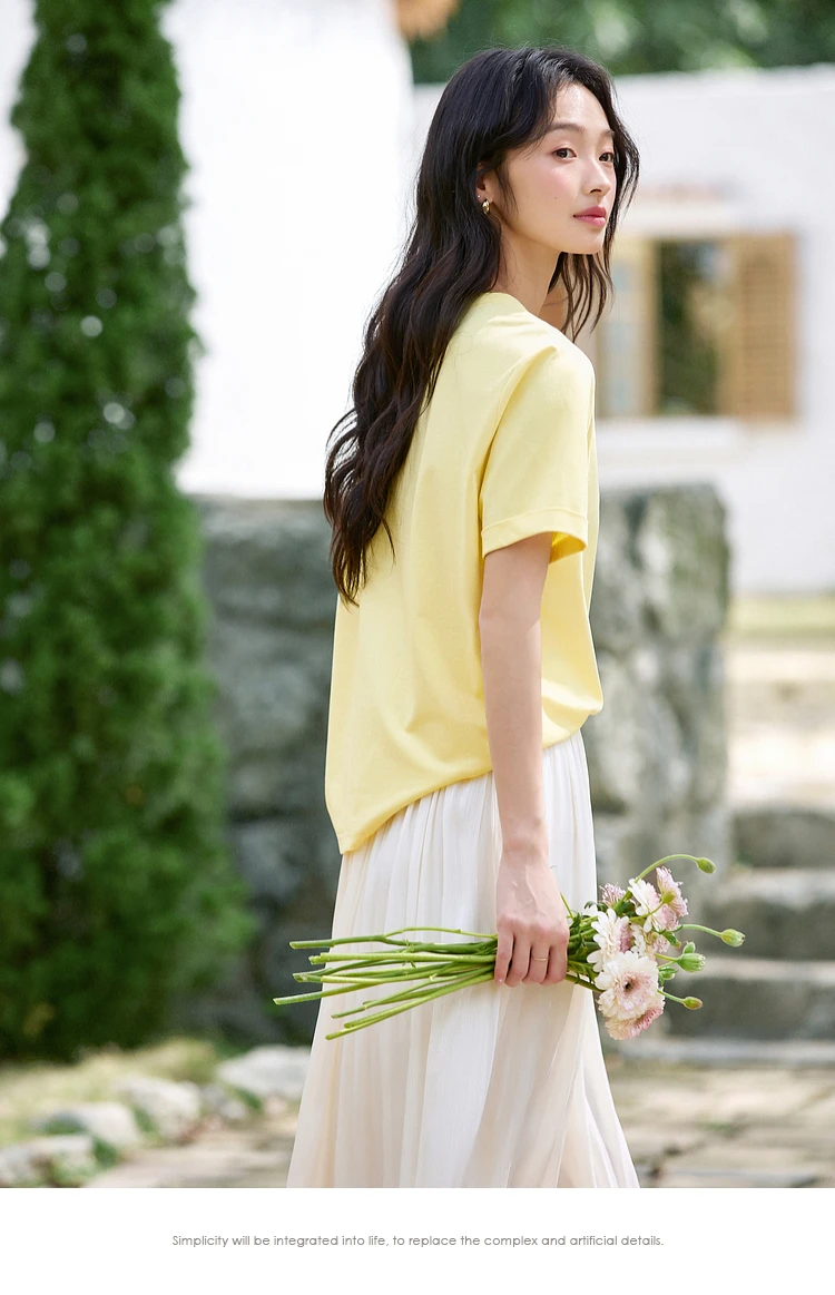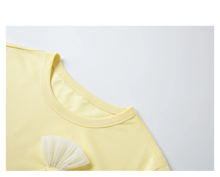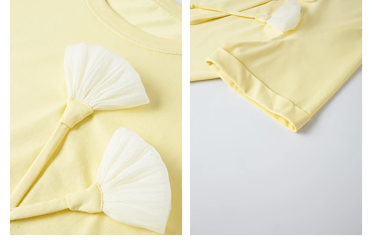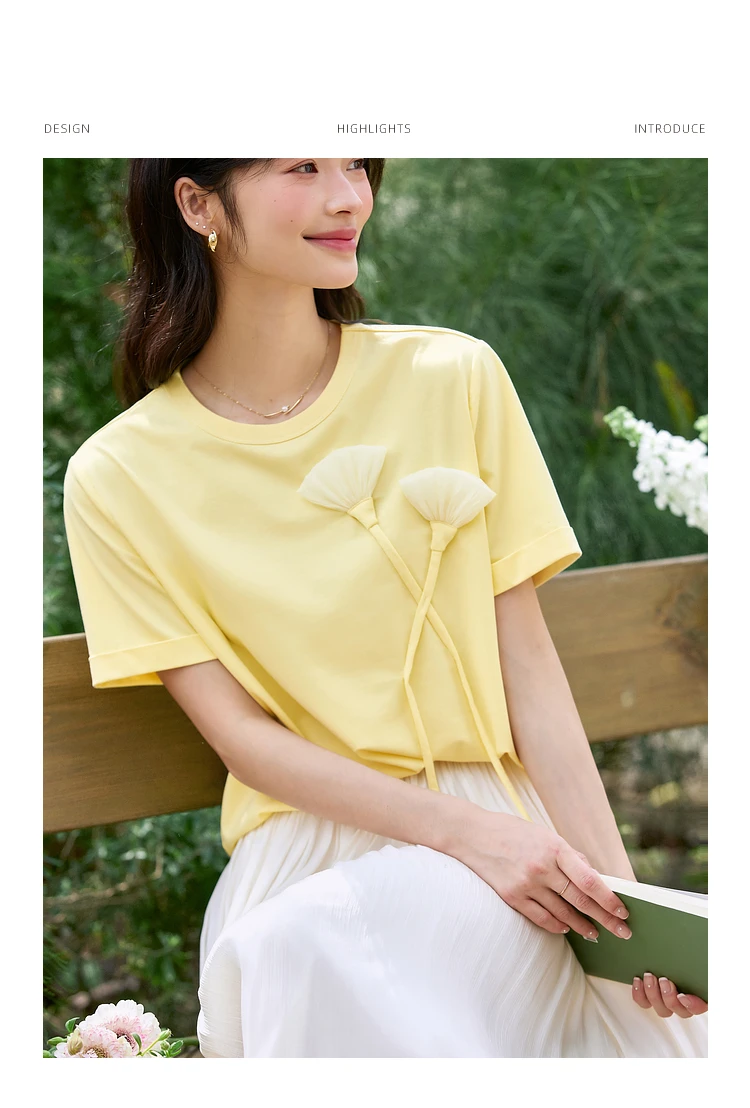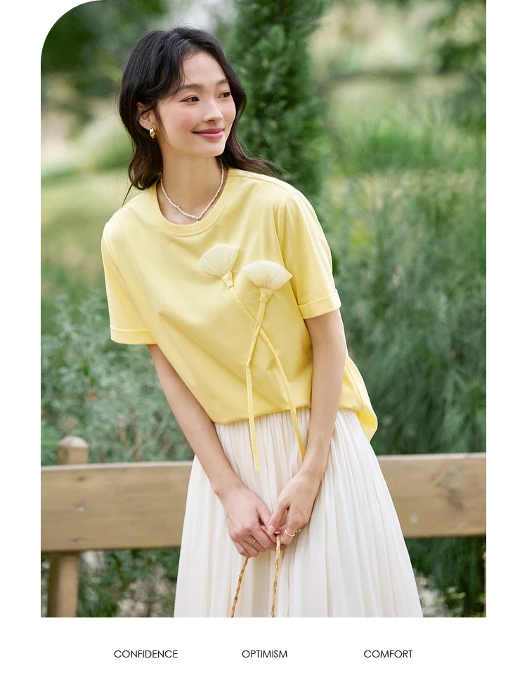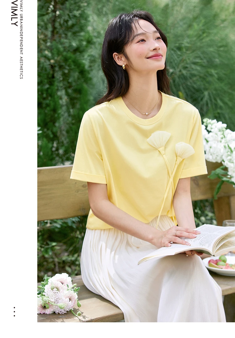 VIMLY Summer Yellow Short Sleeve T-shirt Woman 2025 Fashion Handmade 3D Floral Round Neck Cotton T Shirts Women Clothing A1519